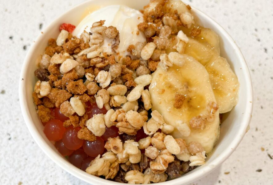 こちらが私が注文した『ヨーグルトアイス』(税込605円)。トッピングは『ブルーベリー』(税込550円)、『バナナ』(税込220円)、『ポッピングポバ/イチゴ』(税込220円)、『ロータスクランチ』(税込165円)『チョコグラノーラ』(税込165円)、『グラノーラ』(税込165円)をチョイス。さらにレジで『はちみつ』(税込330円)も追加。かなりモリモリになりました!