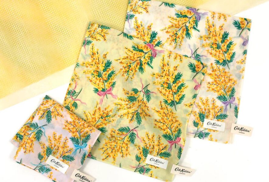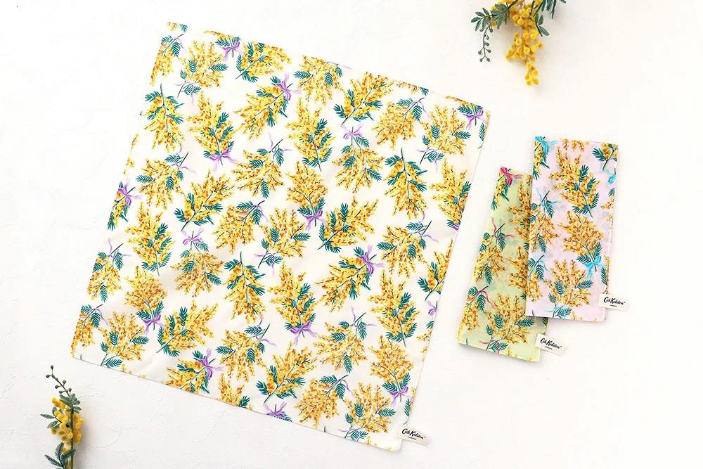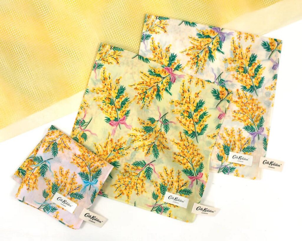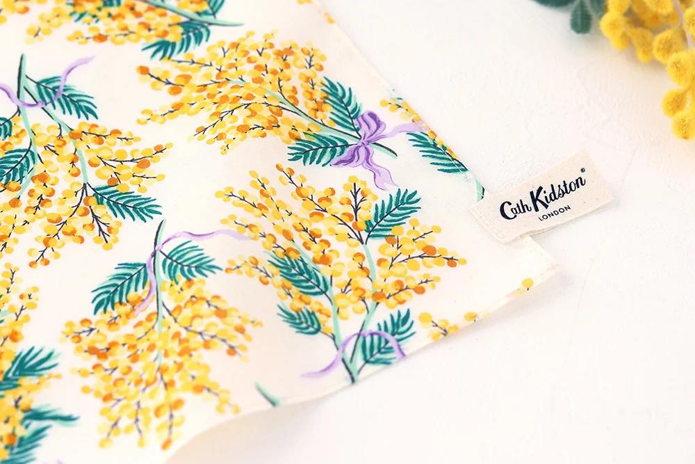 今回ご紹介するのは、季節限定の『Cath Kidston プリントハンカチ ミモザ』。約50㎝×50㎝の使い勝手の良いサイズで、ほどよい張り感のあるコットン生地です。カラーは、アイボリー/ピンク/グリーンの全3色。