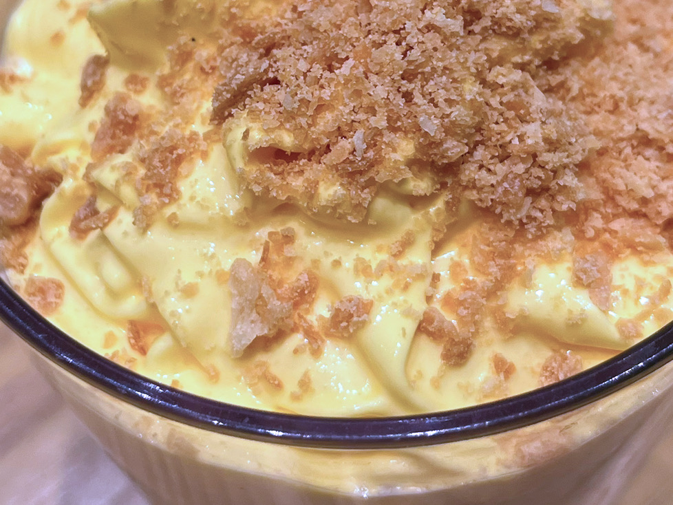 上にトッピングされているのは、シュー生地に見立てたクランチ。その下はカスタードフレーバーのホイップ。華やかな風味のバニラビーンズが使われているそう。鮮やかな黄色がタンポポや菜の花、ミモザなどの、春の花々を連想させます。