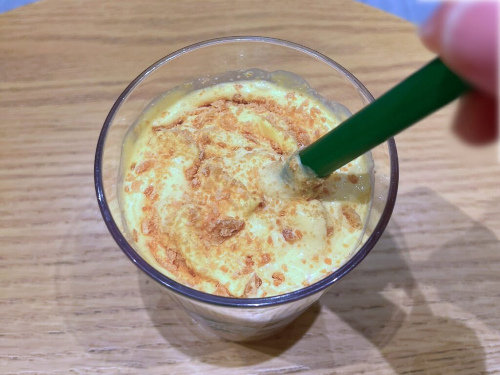 まずはそのまま一口。キャラメルの香ばしさ、バニラの爽やかな風味が重なり合い、カスタードクリームのような濃厚な甘さがヒンヤリと心地よく口いっぱいに広がります。