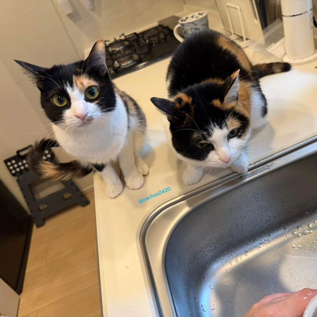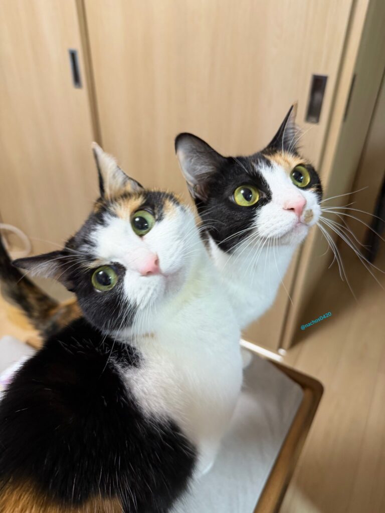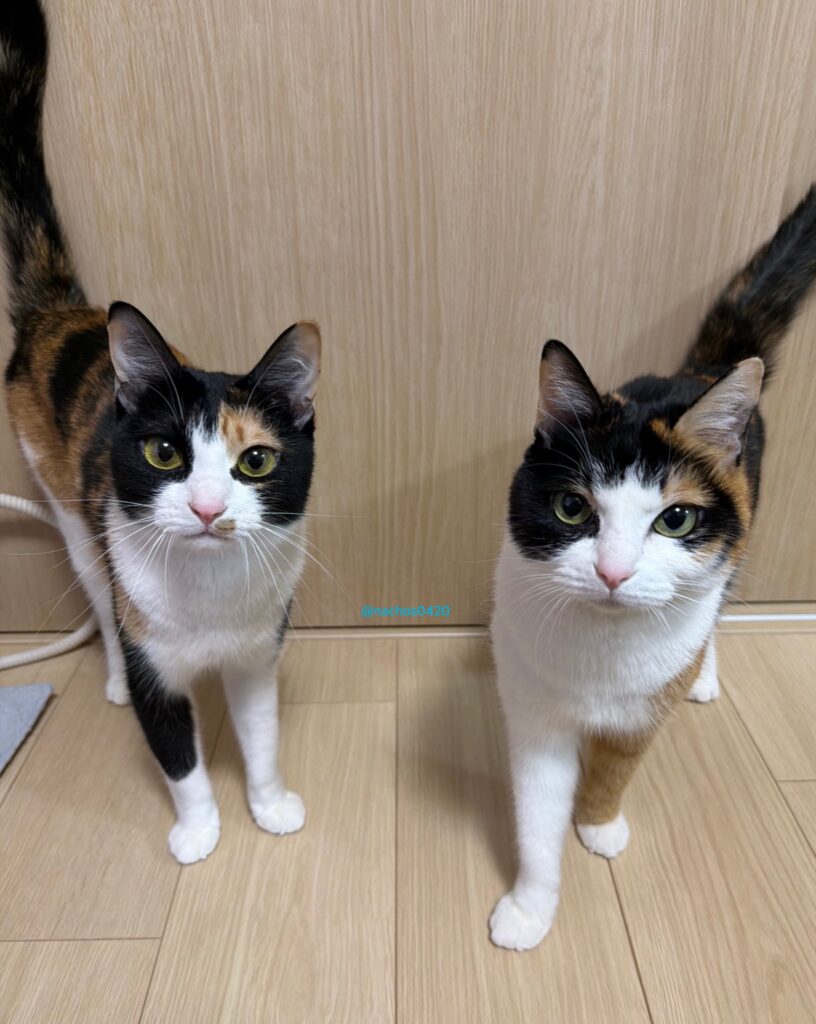 「お互いそんなにくっついたりしないのに、ごはんやおやつの気配を感じると揃って飼い主の前に現れて大声でおねだりしてきます」と、飼い主さんのアカウントには、その様子がたくさん投稿されています。