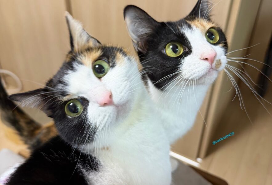 「お互いそんなにくっついたりしないのに、ごはんやおやつの気配を感じると揃って飼い主の前に現れて大声でおねだりしてきます」と、飼い主さんのアカウントには、その様子がたくさん投稿されています。