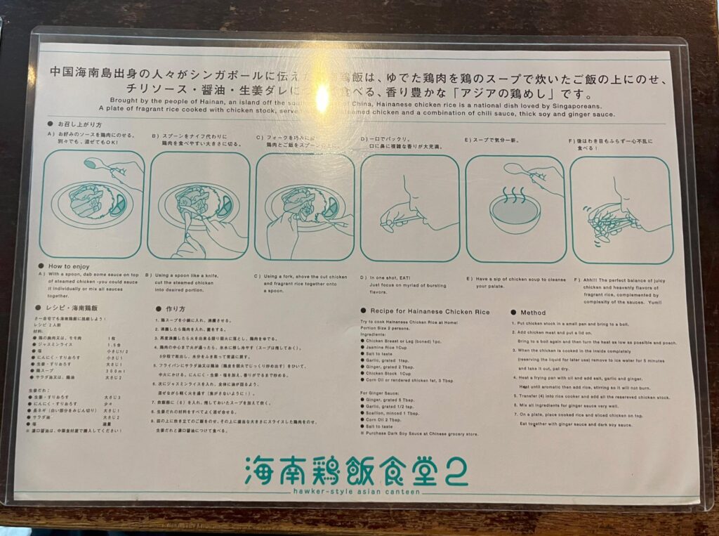 注文を待っている間に、卓上に用意された『海南鶏飯の食べ方』を読んでおきます。初めて海南鶏飯を食べる方でも、安心して楽しむことができますね。