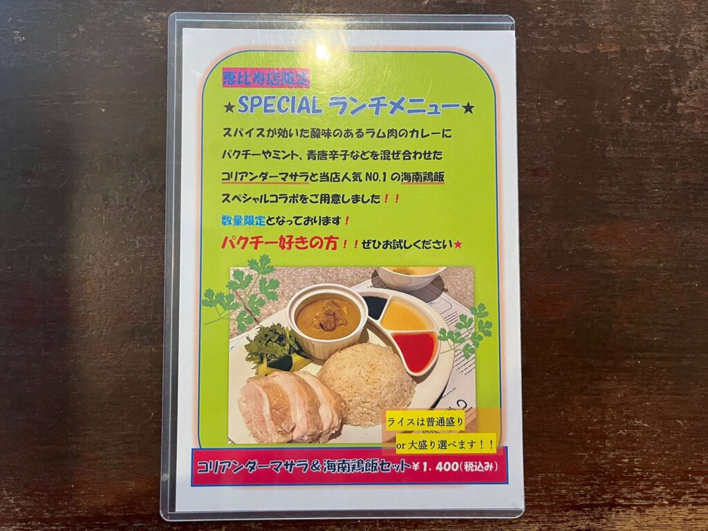 次回は、ラム肉のカレーがいただける『SPECIAL ランチメニュー』(税込1,400円)をいただいてみたいと思います!