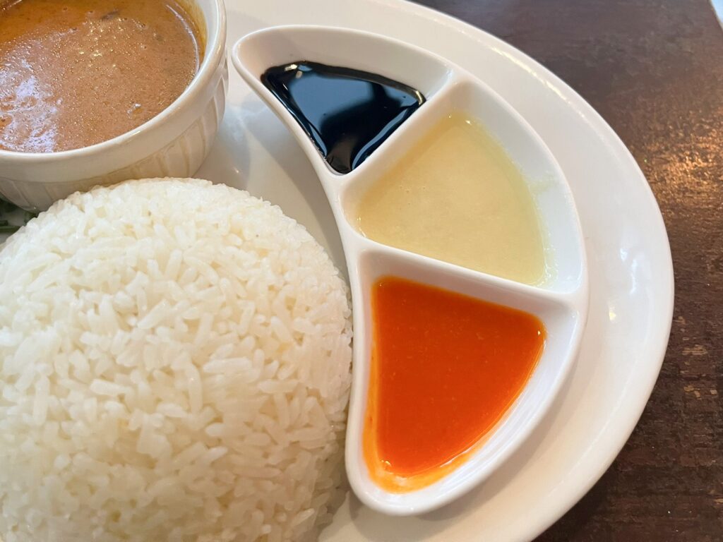 お皿の右側にあるのは、3種類のソース。カラフルでオシャレ~♪上から醤油ベース、ショウガベース、チリベースとなっています。