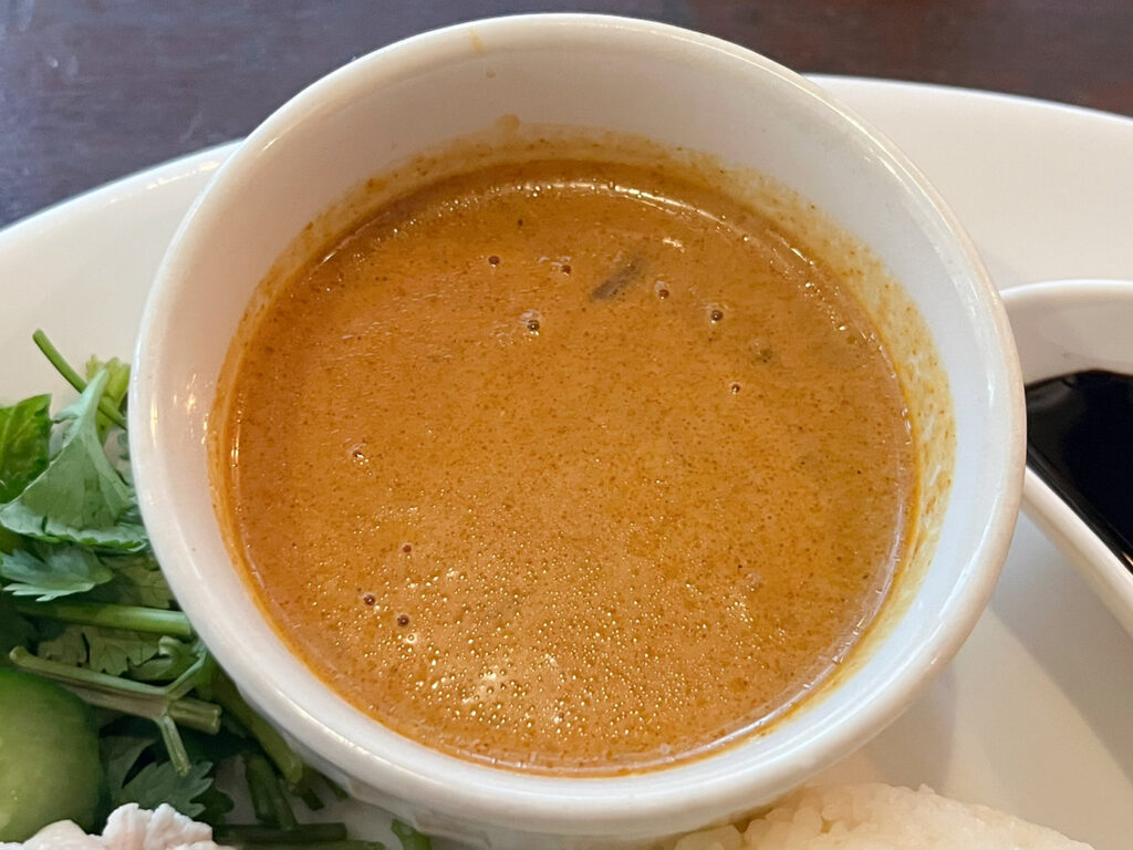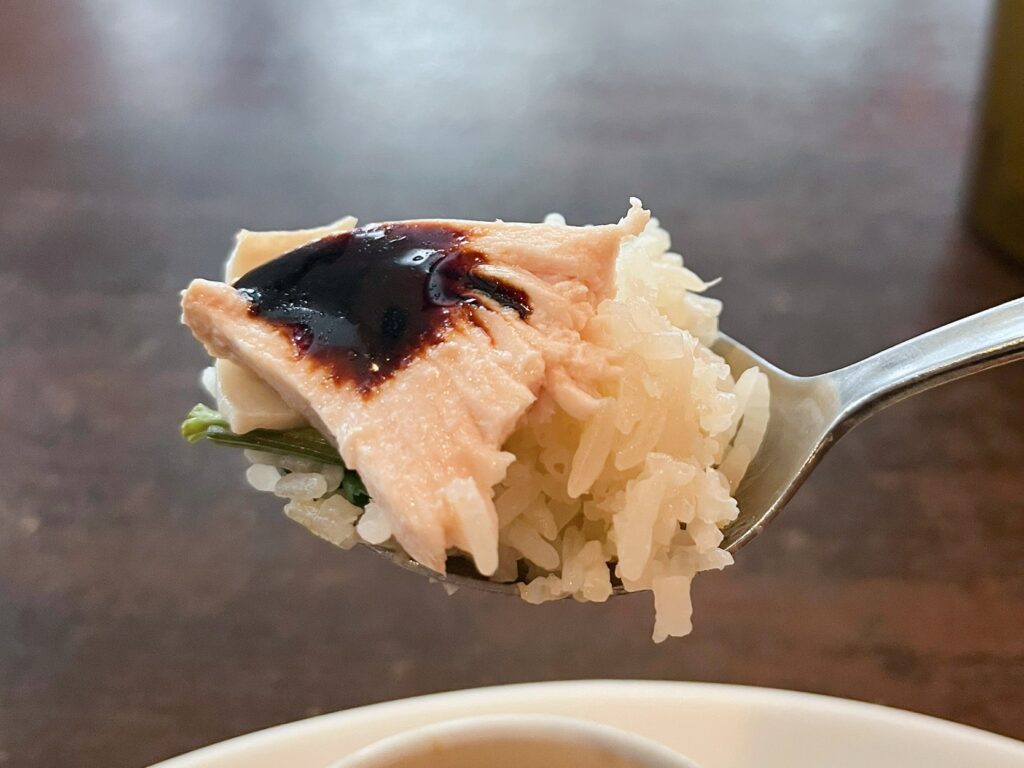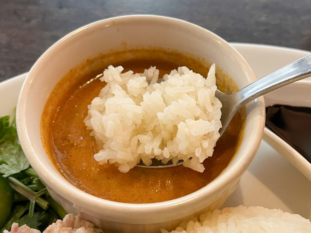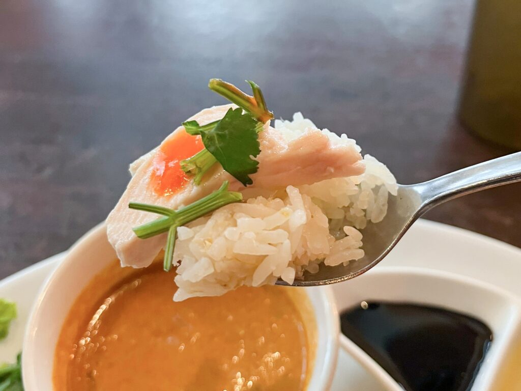 今度はご飯とパクチー、ソースと一緒に。鶏肉の旨みをたっぷり吸わせたご飯、肉自体の味わい、パクチーならではの風味、そして全てをまとめ上げる、ピリッとしたチリソースのバランスが最高~!