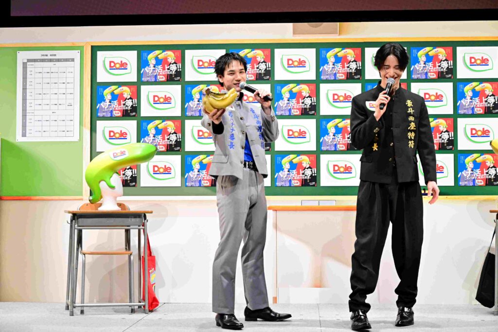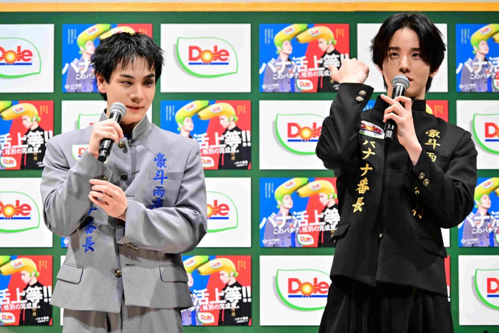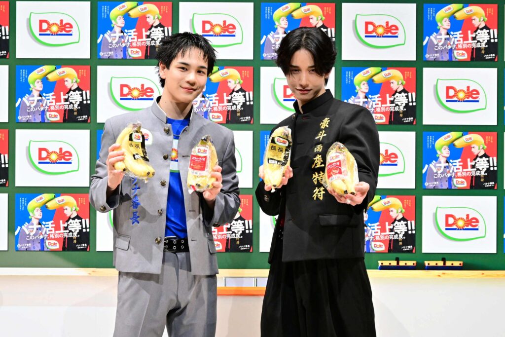 「Doleバナ活サポーター バナナ番長」の佐藤景瑚(JO1)、今回から強力なライバルとして参戦する豆原一成(JO1)が都内で行われたPRイベントに登場した。