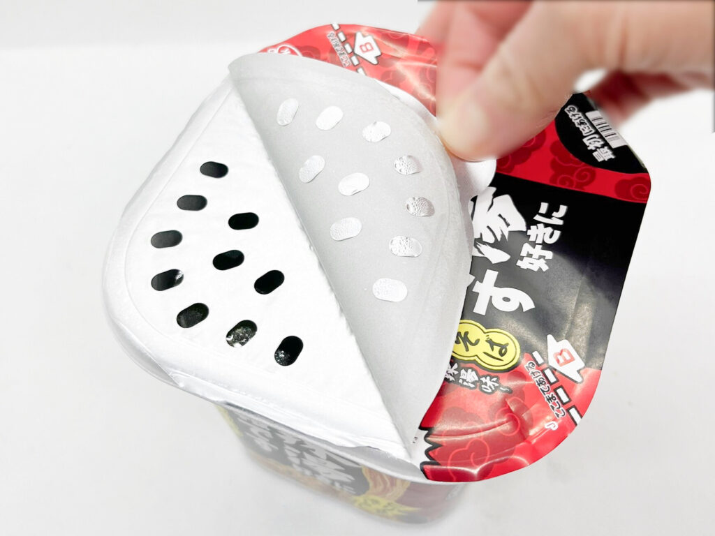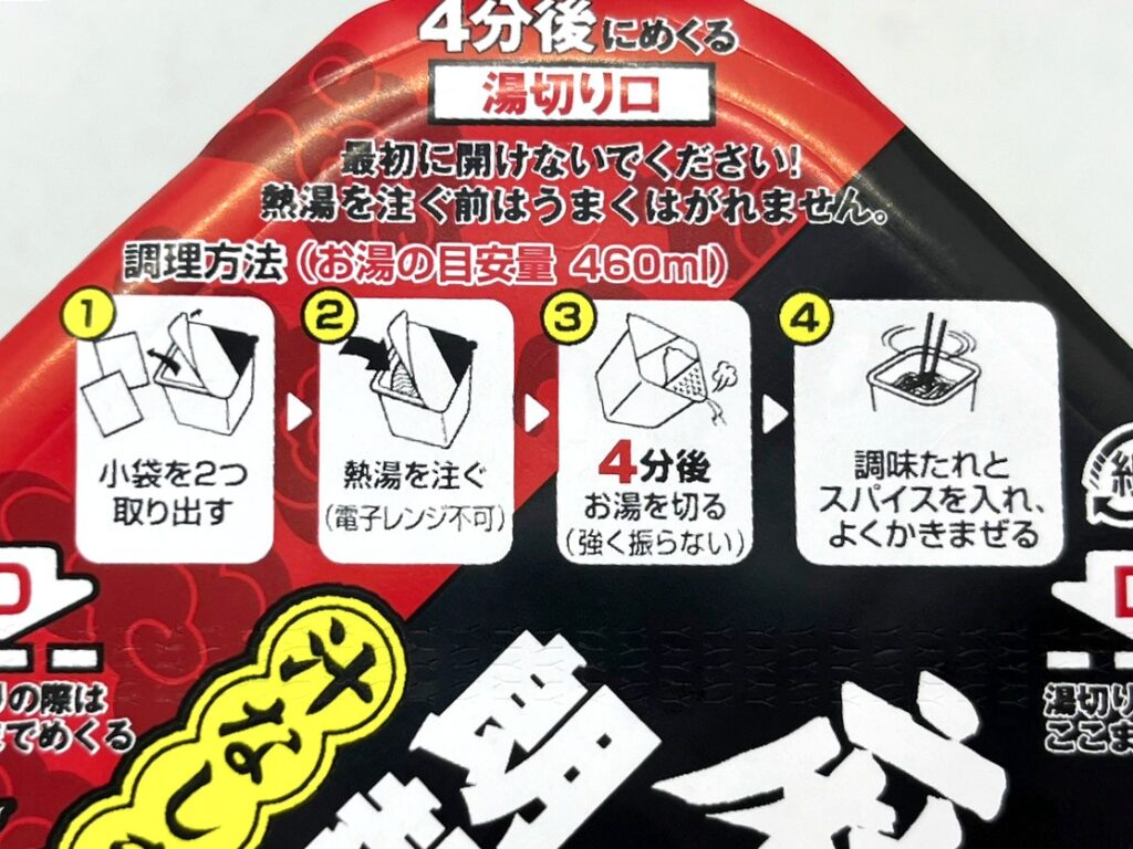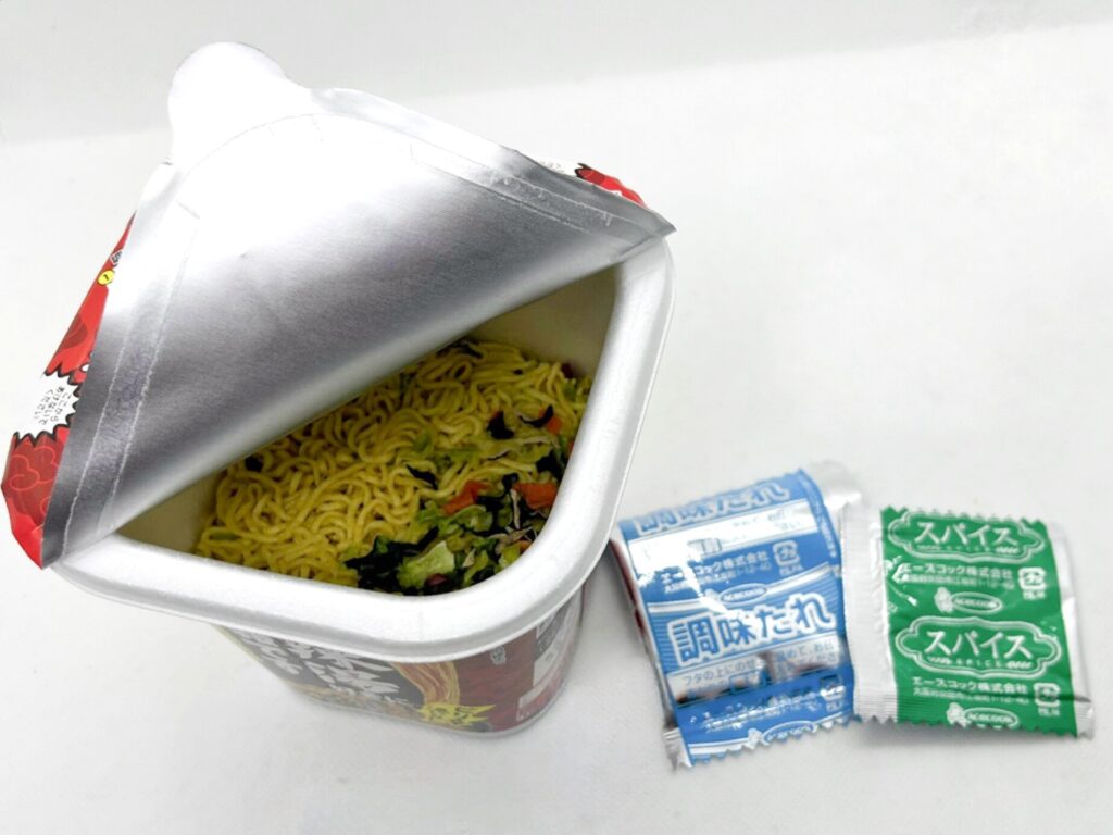 まずはフタを半分くらい空け、中の“調味たれ”と“スパイス”の小袋を取り出します。