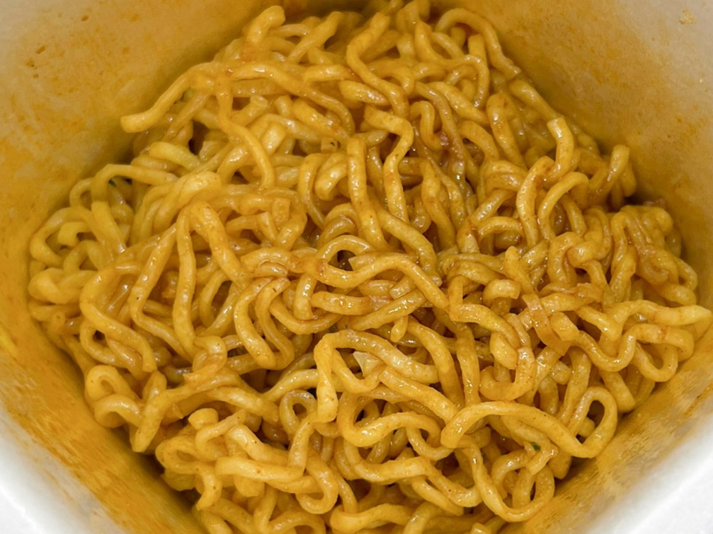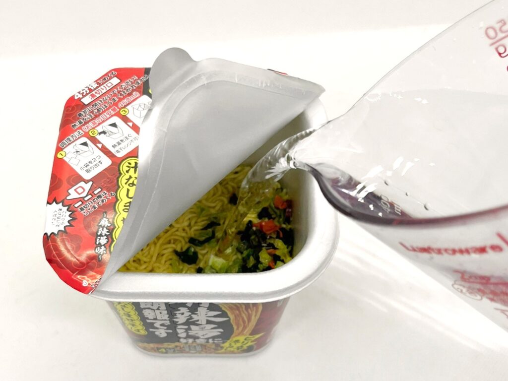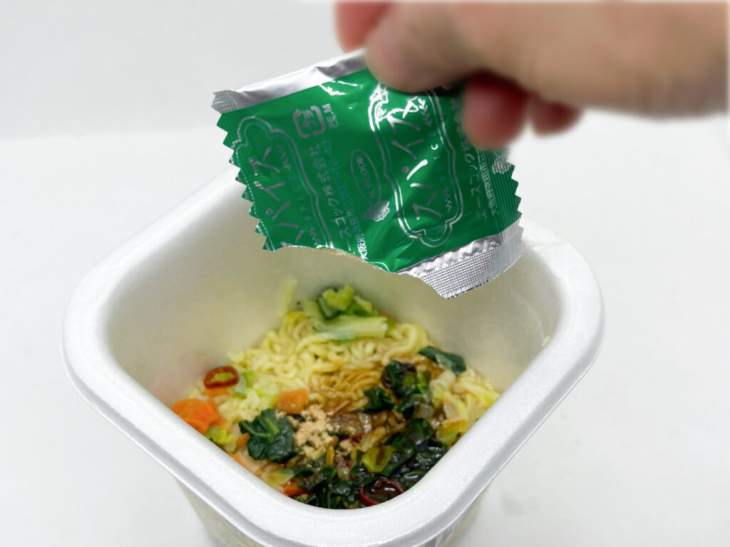 “調味たれ”と“スパイス”を入れます。たれの方はそれほど香らずでしたが、スパイスは麺にかけている間中、唐辛子や花椒などのスパイシーな香りが漂っていました。