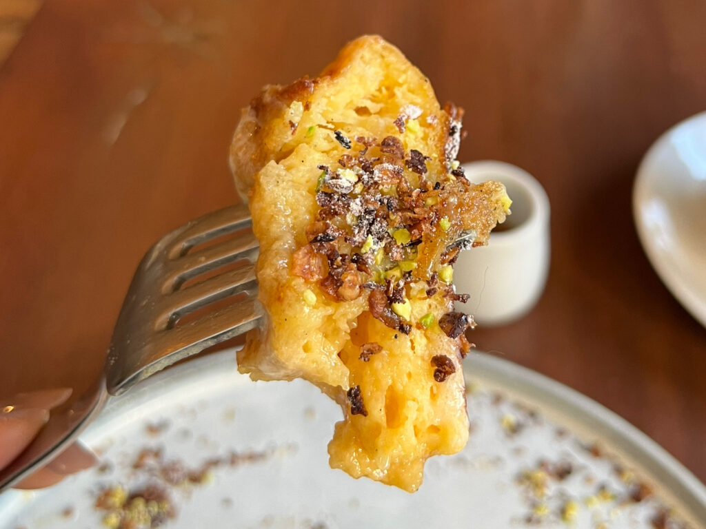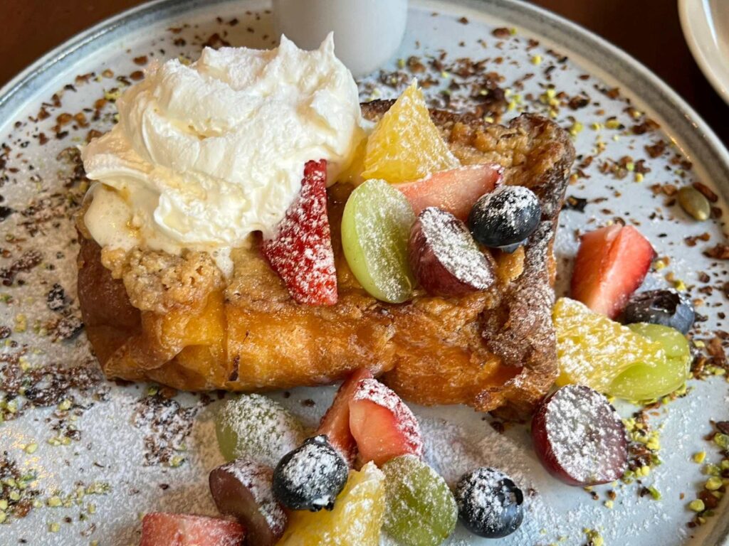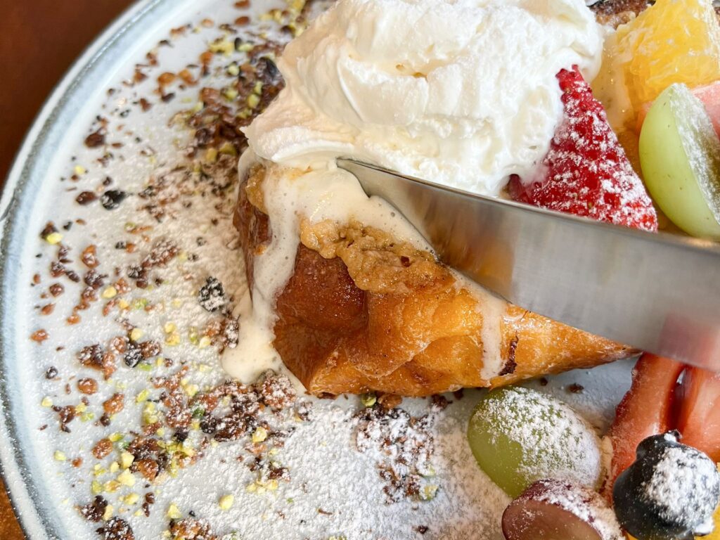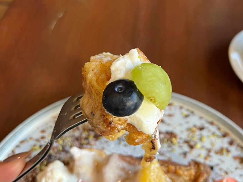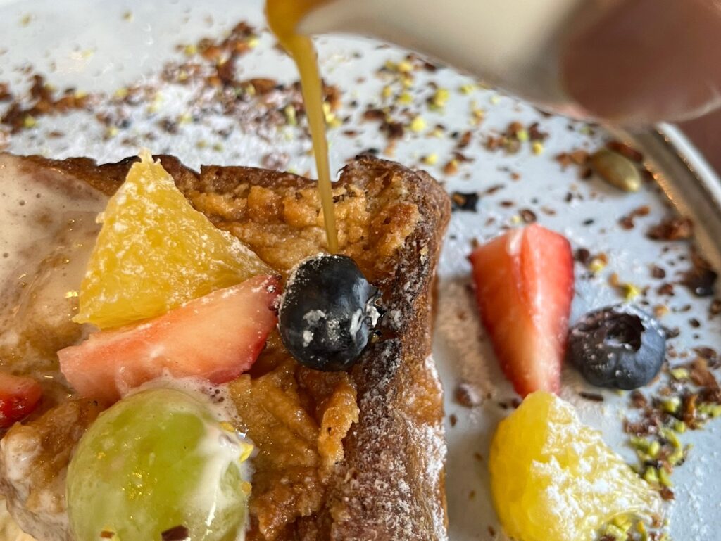 周りに散りばめられたナッツ類を乗せたり、フレンチトーストやフルーツだけで食べたり、ホイップをたっぷりトッピングしたり……楽しみ方が無限に詰まった一皿でした。