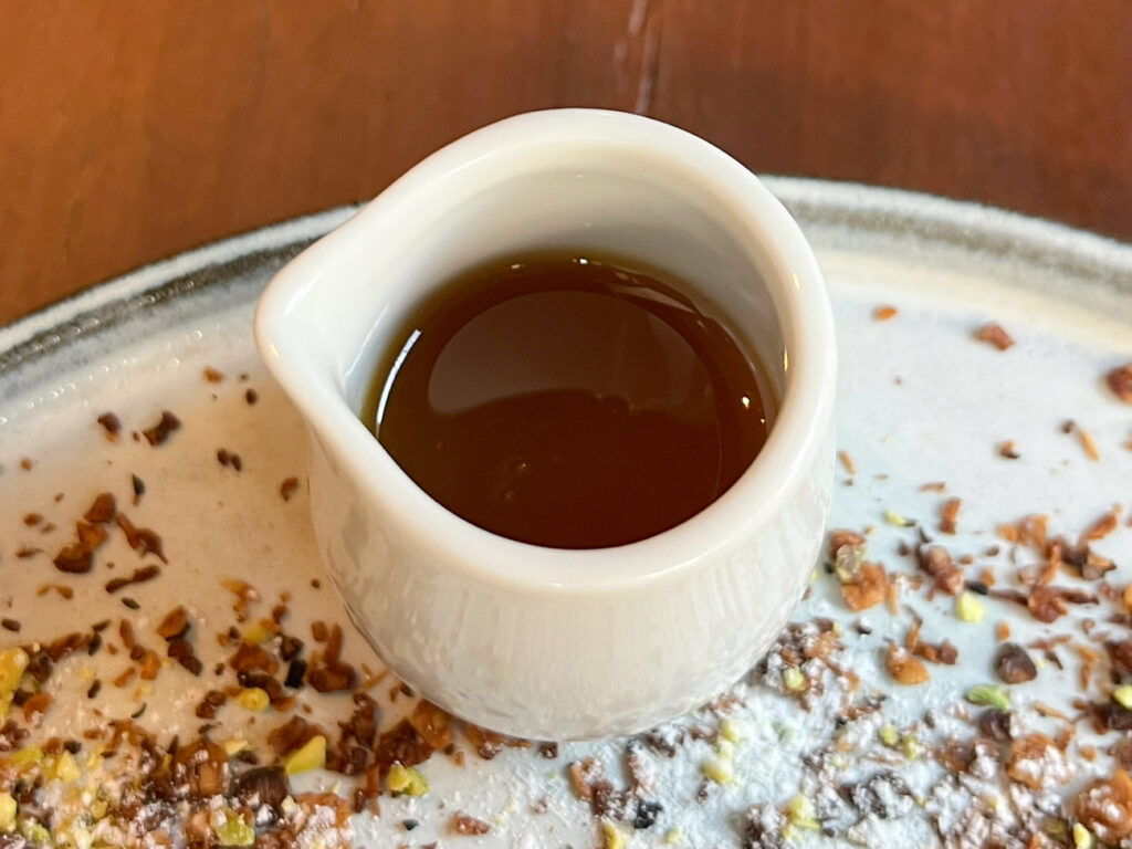 一緒に提供されたのは、こちらもオレンジ風味のメープルソース。「お好みで追加してください」と丁寧に説明がありました。