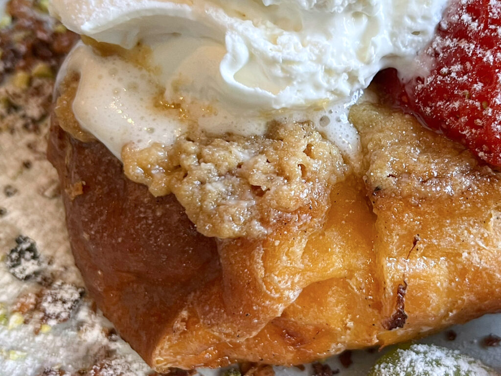 持ち上げるのが難しいほど、ぷるぷるで柔らか~い。食べてみるととろける!優しい卵の風味と甘み、パンの旨みが混然一体となってたまりません。熱々のフレンチトーストとヒンヤリしたホイップが生み出す温度のコントラストも最高。パンの外側はカリっと焼かれていて、その香ばしい味わいも絶妙でした。