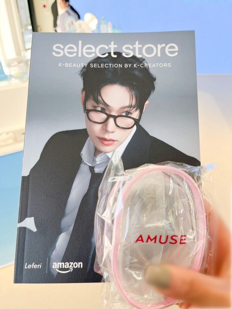 入場してすぐに特典をゲット!韓国を代表するビューティークリエイターであるレオジェ氏が表紙のパンフレットと、若い女性を中心に人気の韓国コスメブランド「AMUSE(アミューズ)」のポーチをもらえました。
