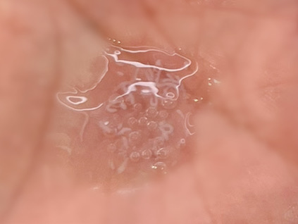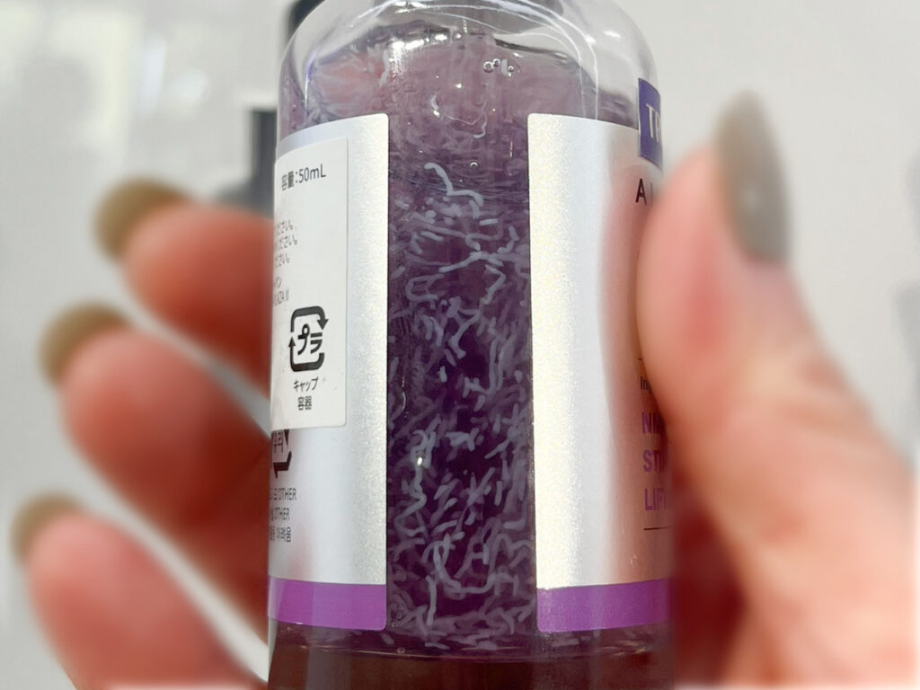 手のひらに出すとこんな感じ。第3世代ペプチド糸とマイクロスピキュールを組み合わせた、独特の糸状テクスチャーがフェイスラインを引き締めます。加齢により広がった毛穴まで集中ケアするのだとか。これは買い!
