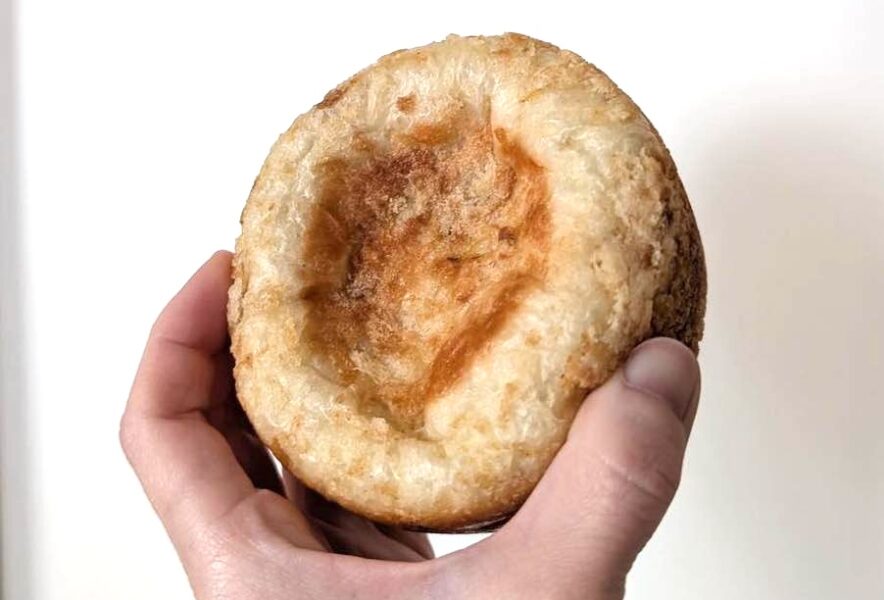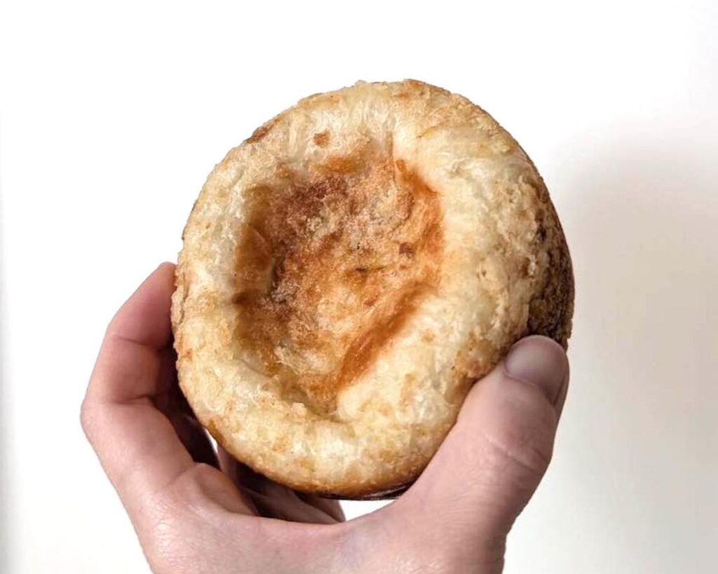 まず手に取ったのは、同店の代名詞ともいえる「バーミキュラの無水カレーパン」(税込580円)。トレイに乗せた瞬間、そのずっしりとした重みに驚かされました。自宅で軽くリベイクすると、表面のカリッと感がさらに際立ち、香ばしいスパイスの香りが漂います。