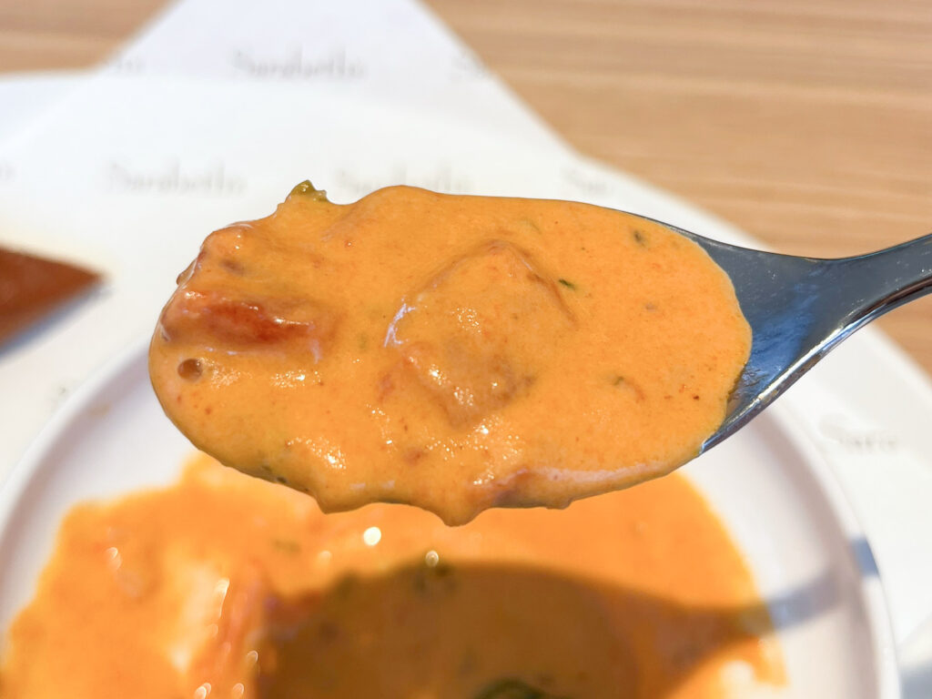 ではまずスープから。野菜の旨みがぎゅっと詰まっていて美味しい~!濃厚でありながらもさっぱりとして、素材それぞれの味を感じます。トマトの酸味も程よく、まさに食べるスープといった味わいと食感でした。