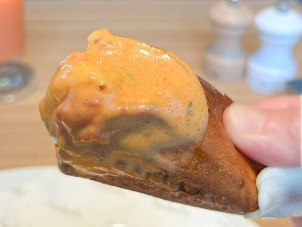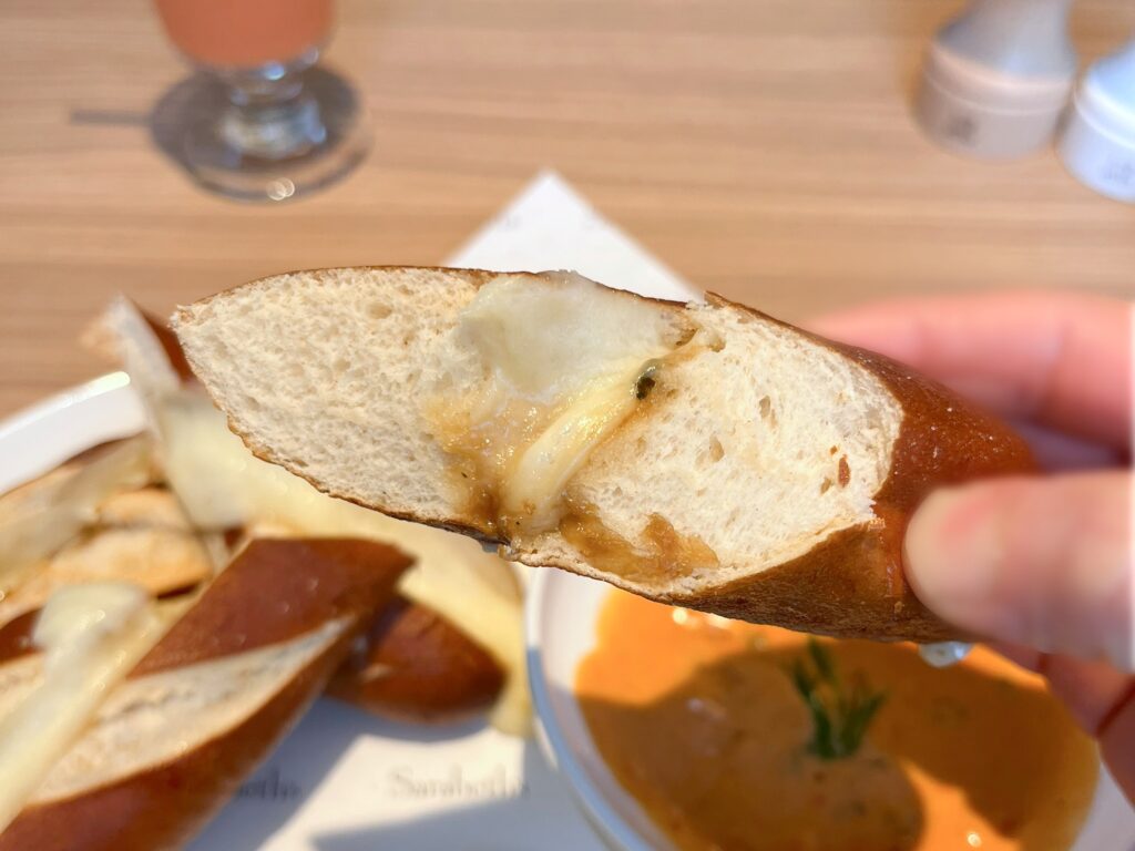 プレッツェルチーズサンドは、外側がサクサクカリカリと香ばしく、中はふんわりもっちり。豊かな小麦の風味とチーズの濃厚なコクがよく合い、食べ応えバツグンです。