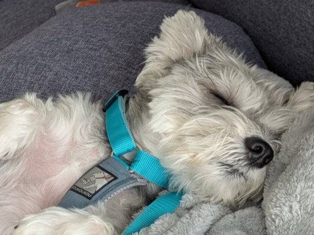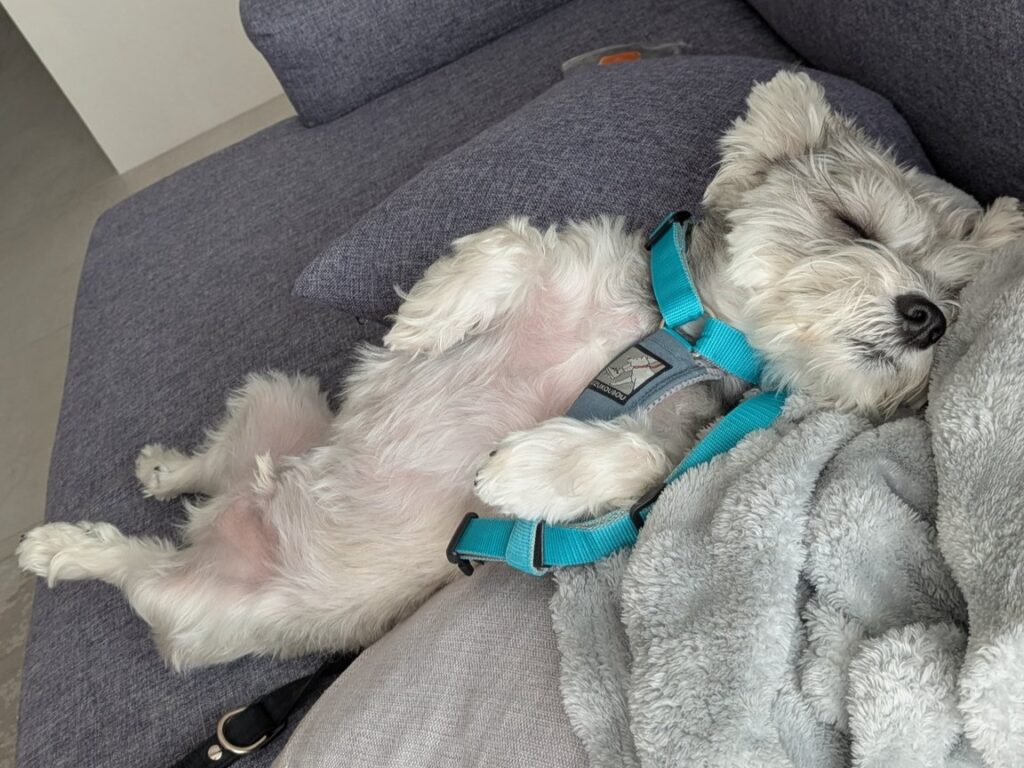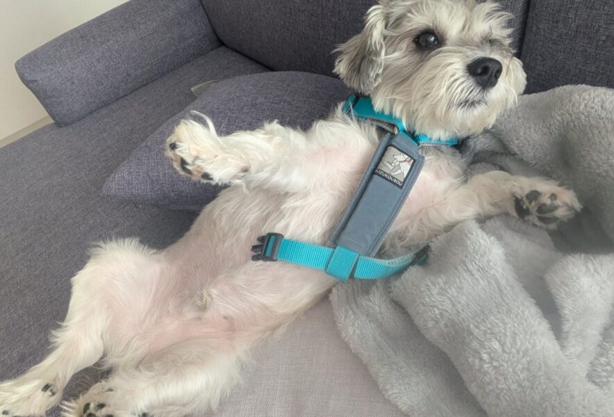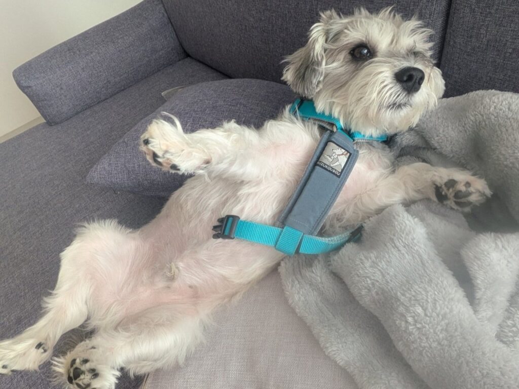 「散歩が嫌いでいつもハーネスを付けようとするとテーブルの下に隠れたりするのですが、今日は珍しくすんなり付けさせてくれるな、と思ったら寝ていて驚きました」と、飼い主さんが撮影時のことを教えてくださいました。
