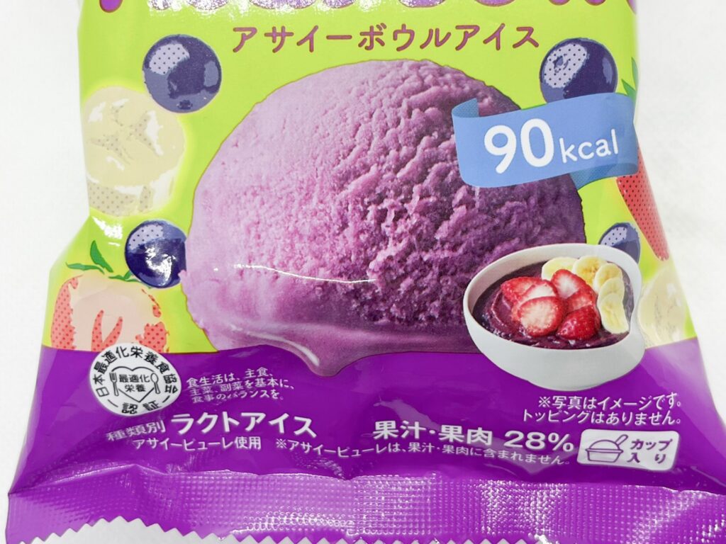 こちらが近所のセブン-イレブンでゲットしてきた『完全メシ アサイーボウルアイス』。税抜278円です。“完全メシ”シリーズは、厚生労働省が提案する“日本人の食事摂取基準”に基づき、33種類もの栄養素(たんぱく質、脂質、炭水化物、ビタミン、ミネラルなど)と美味しさのバランスを追求した機能性食品ブランド。これまでカップ麺や冷凍食品など様々な形で展開されてきましたが、今回はアイス!とても気になります。