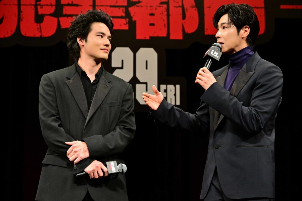 カーチェイスならぬチャリンコチェイス場面も話題。水上が「夜間に新宿アルタ前などを封鎖して撮影をさせて頂きました。面白い場面になりましたが、本当に大変でした。僕とユンホさんはママチャリで福士さんとオム・ギジュンさんはロードバイク。ひと漕ぎで進む距離がまったく違うし、乳酸の量も違うから」と苦労を滲ませると、ユンホも「撮影後は太ももがムキムキになりました」と苦笑い。